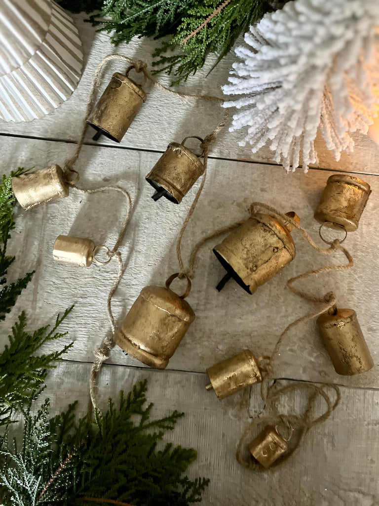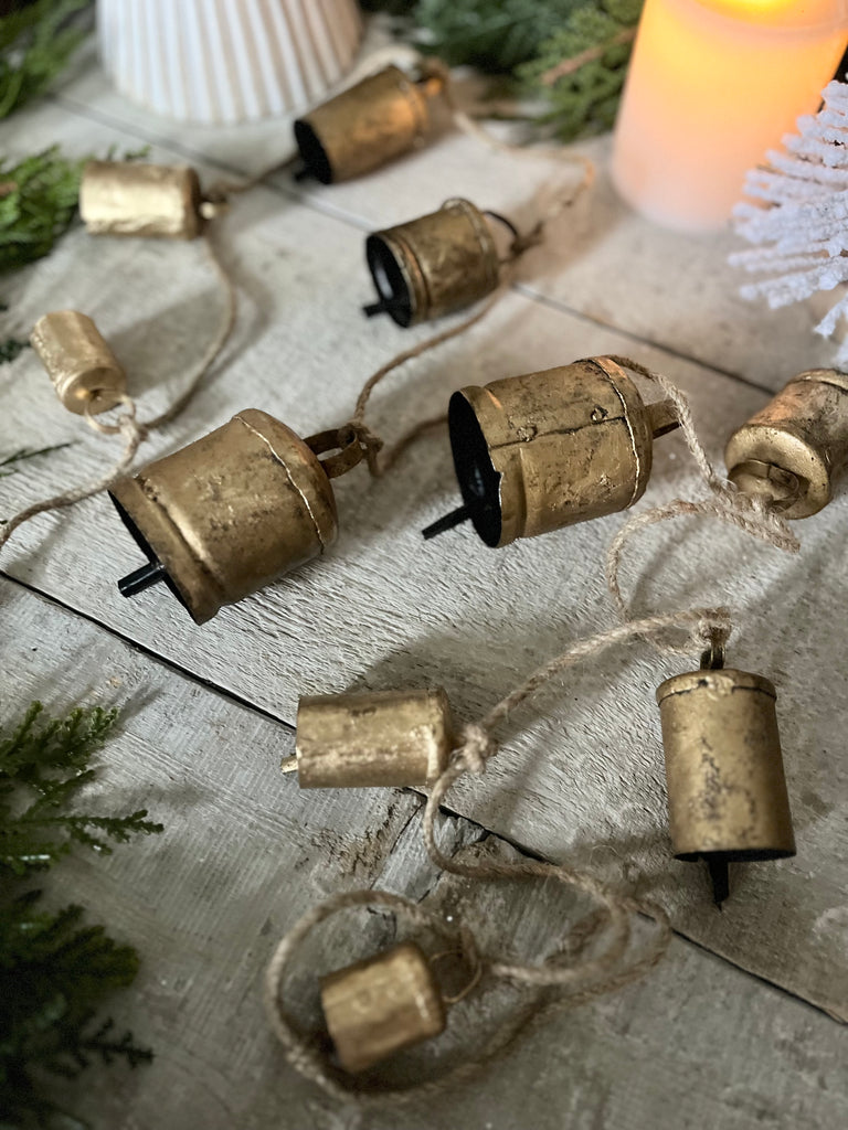 The rustic bell garland features hand made up-cycled copper an Indian cowbells with mango wood clappers and tied natural jute rope.